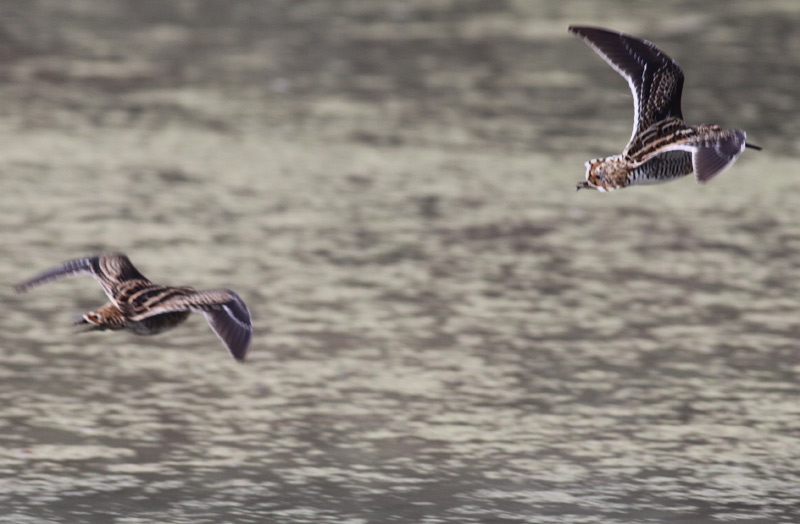 Beskrivelse: Sibirisk Bekkasin har rundere og mere gråtonet hånd end dobbeltbekkasin. Overvingens mest påfaldende karakterer er de lyse "glentepartier" på armen og de brede hvide spidser på hånddækfjerene. Vingen mangler dobbeltbekkasinens tydelige hvide bagkant (kan dog være svag) - der ses fint på den betydelige mere mørkvingede Dobbeltbekkasin til højre.