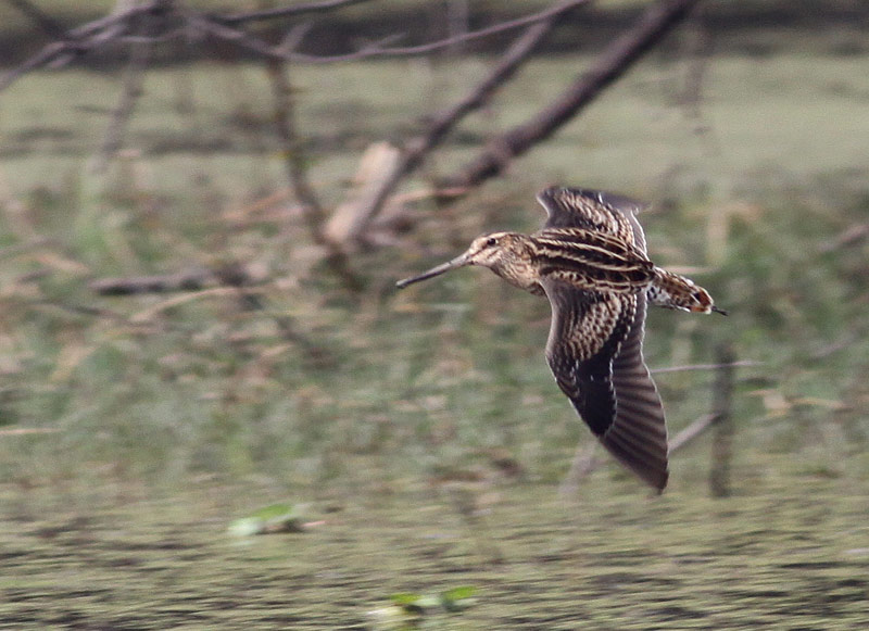 Andrea Corso, der netop er ved at fuldende en artikel om artsbestemmelsen tilføjer de korte yderste halefjer (der godt kan anes her) som en yderligere karakter, dog især i forhold til Taigabekkasin. Det medvirker til en mere kileformet hale (ravneformet, iflg. Andrea), som jeg undertiden har bemærket i flugten, hvor de meget tynde halefjer under landing kan give indtryk af en lidt plusket og "slidt" hale.