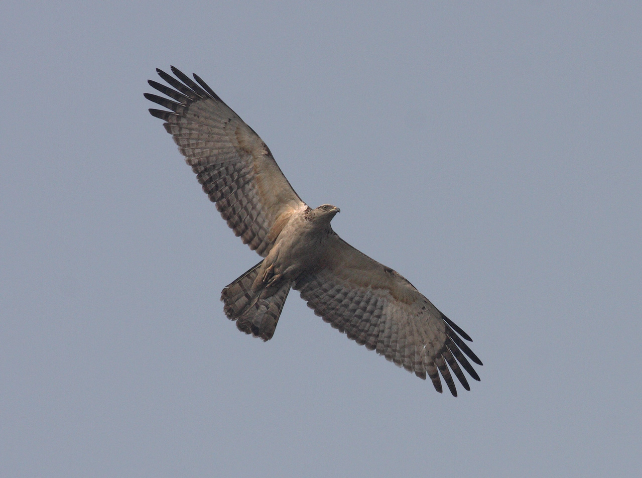 Ung Crested Honey Buzzard (Tophvepsevåge(Østlig Hvepsevåge). Denne lyse ungfugledragt volder tit problemer da den som påpeget kan ligne ung høgeørns ganske meget, men hovedet er ikke kraftigt nok, fuglen mangler de mørkspidsede store dækfjer/hånddækfjer, og haletegningen - med veldefinerede tværbånd - er lige i øjet til vågen - de rundede halehjørner desuden.