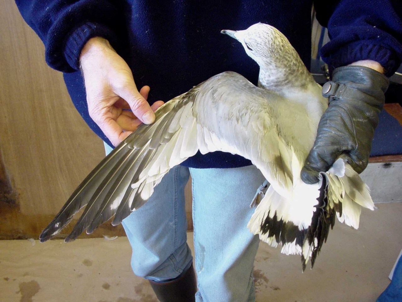Beskrivelse: Stormmåge 2 W med markant sort halebræmme. Flere tegn på en afvigende L.c.canus eller måske en brachyrhynchus. Fuglen er ringmærket i Klitmøller, Thy den 21/2-2010 sammen med stormmåger. Målene er : Vinge 350 mm, næbhøjde over gonys 10,5 , tars 49, næblængde 33,3, kranie 87 mm. Klaus Malling Olsen har følgende kommentarer til fuglen: <i>"Dette er faktisk en ret spændende fugl! Det meget korte vingemål er mindre end nogen Stormmåge refereret i Gulls (alle baseret på skind), og falder indenfor variationen hos brachyrhynchos (bare "brac" længere fremme - det andet er for besværligt at skrive fuld ud hele tiden!) Brac har hyppigere end canus mørkt halebånd i denne alder, men det er ikke ukendt hos canus/heinei - se "Gulls"; i forhold til Grant fandt vi karakteren hos en større andel, hvilket grunder sig i, at det synes at være hyppigere hos heinei og andre former end hos vesteuropæiske canus. Det er dog ualmindeligt bredt for canus - se foto nr. 80 s. 91 i "Gulls!" for hvordan en brac kan se ud! Ligeledes er mørke tegninger på hånddækfjerene hyppigere hos brac end hos canus m.m., men dog ikke ukendt. Dette bortforklarer ikke yderligere afvigelser: 1: øjet ser lysere ud end jeg har set det hos tilsvarende alder af canus, men formentligt muligt. Langt hyppigere er det hos "brac", der jo bliver lysøjet som adult (hvilket godt nok er kendt, men betydeligt sjældnere hos canus og heinei. 2: hovedtegningerne er specielle: langt mere udvandede (ala den efterhånden velkendte "århushætte") end normlt hos canus, og kunne ligeledes antyde en "fjern" herkomst, se ill. 78 på s. 91 i "Gulls". Sammenlagt en meget spændende fugl med en del karakterer der kunne tyde på brac! Du er meget velkommen til at lægge fuglen på Netfugl med mine kommentarer. bedste hilsener Klaus"</i>