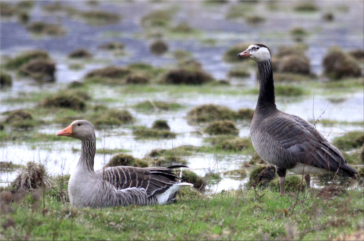 Beskrivelse: Er det denne hybridgås et kryds mellem canadagås x grågås? Parret holder sammen ved Vejlen, Taasinge d. 6. april 2010