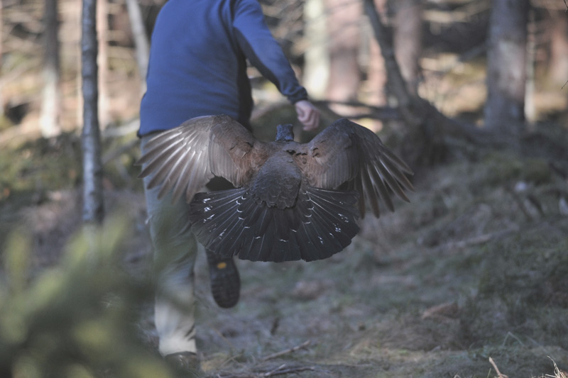 Beskrivelse: Tjurhanen jager en mand ud af skoven, eller prøver ialtfald på det. Den formåede at skabe respekt om sig.