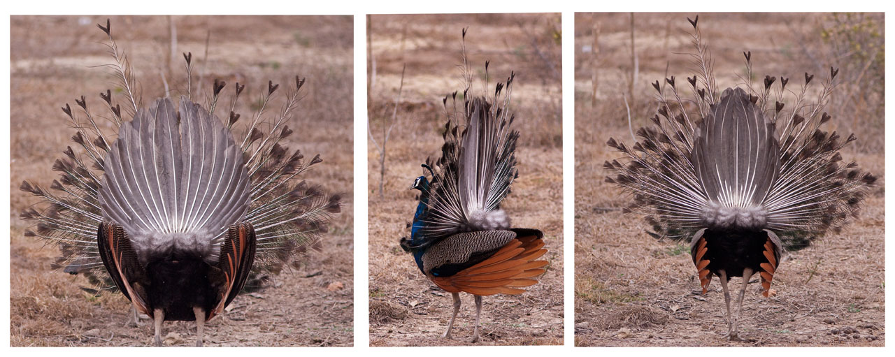 Beskrivelse: Bagsiden. Yderligere studiecollage: denne gang bagfra- og sidebilleder af dansende juv påfugl male.