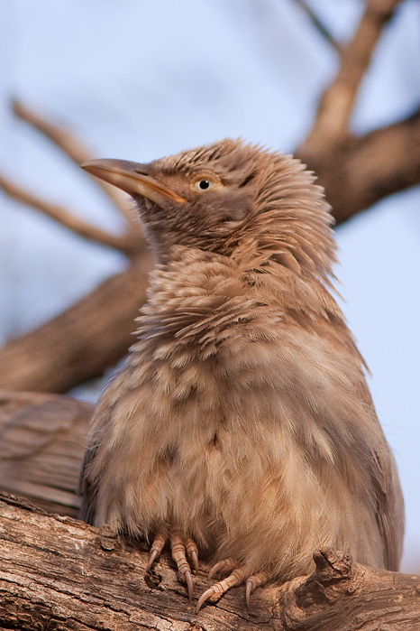 Beskrivelse: Identifikation : til sammenligning med tidligere opsendt billede af larmdrossel, nu bestemt til grå larmdrossel - Turdoides malcolmi. Billedet her af Jungle Babbler viser lysere øje og manglende sort tøjle