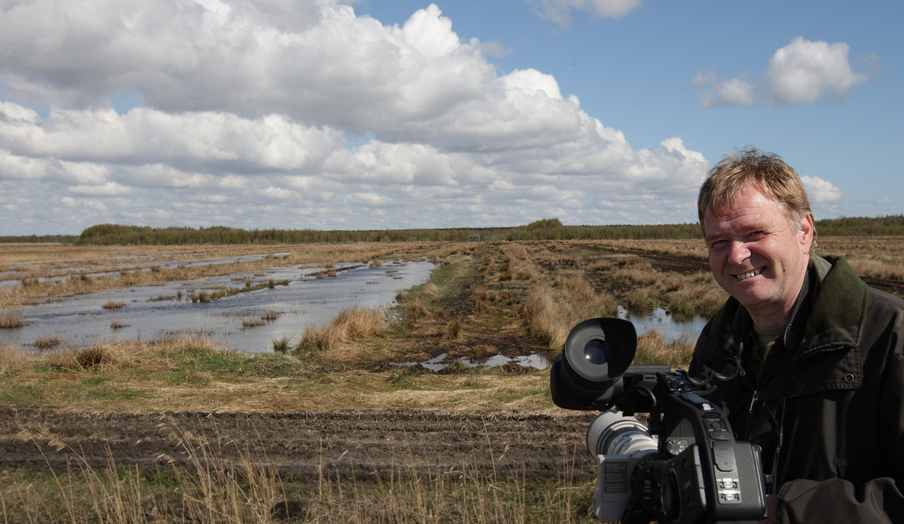Beskrivelse: Videfotografen Flemming Ahlmann med udstyret på plads i Sneppeklireland på Hegnsvej i Lille Vildmose med udsigt til Høstemark Skov i baggrunden.