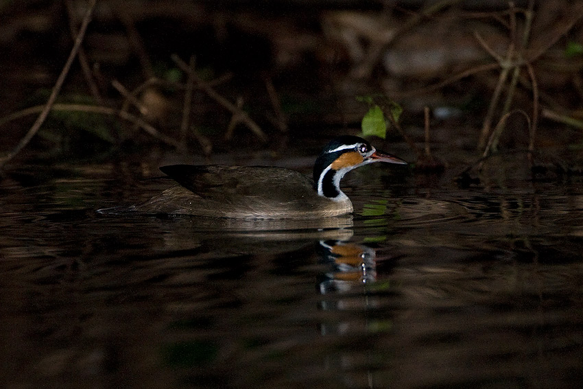 Denne fugl er fra hovedkanalen der løber parallelt med kysten, ca ti minutters sejlads fra billetkontoret i Tortuguero. Fuglen blev set midt i kanalen, men inden vi nåede frem var den svømmet ind i mørket mellem rødderne langs brinken. Billeder er taget kl. 06.25 ca en halv time efter solopgang. Jeg har benyttet blitz med teleekstender, for vi kom aldrig nærmere en 25m.