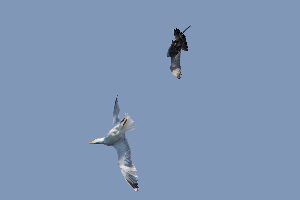Beskrivelse: Vandrefalkhannen er netop blevet afløst af hunnen, og måske havde den opsparet en masse energi, der nu skulle fyres af, eller også havde den set sig irriteret på de altid galpende måger. I hvert fald gav den sig til at jage-mobbe samtlige Sølvmåger, der var i nærheden. Fantastisk flyveopvisning, som det stort set var umuligt at følge med kamera fra en vippende jolle, og øjet havde faktisk også svært ved at følge med. Én enkelt gang kostede nærkontakten en Sølvmåge en masse fjer. Et par gange vendte jagten om - så var det en af sølvmågerne, der jagtede falken. Til sidste forlod Vandrefalken scenen og forsvandt ind over land.