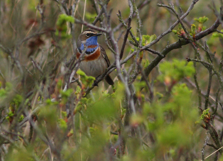 Beskrivelse: Meget skulkende blåhals. Var fremme i få sekunder af gangen - måske fem gange på en time. I øvrigt var min tur med forventning om Nordlig Blåhals - der var flere meldinger i Danmark i dag.