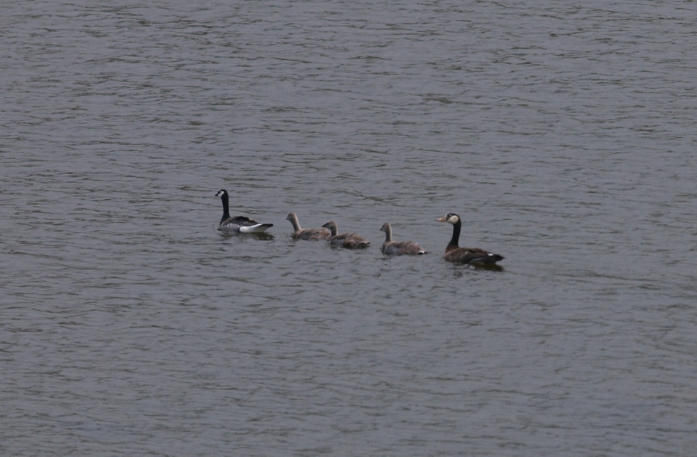 Der er 62 ad. bramgæs, mindst fire bram x canadagås og mindst 2 grå x canadagås. Der er mange ynglepar af bramgås i år, men den fotograferede bramgås og grå x canadagåsen blev konstant set sammen. Men ja, om ungerne har andre forældre ved jeg ikke. Jeg har ikke bedre billeder af bramgåsen, men der var ikke umiddelbart noget ved fuglen, der ledte tankerne i retning af en hybrid.