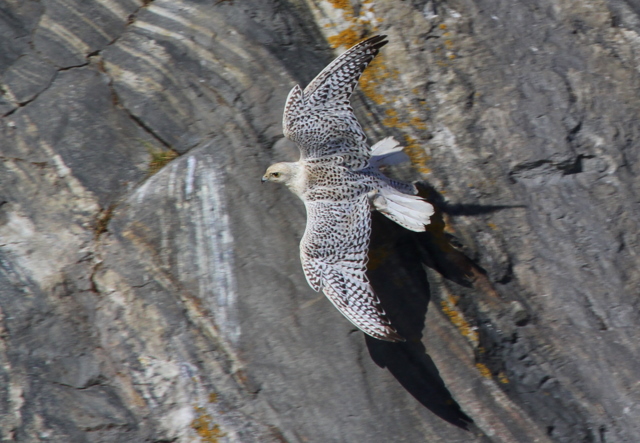 Beskrivelse: Jagtfalk jager mågeunger i mågekoloni i Godthåbsfjorden ca. 90 km NØ for Nuuk.