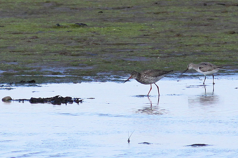 Beskrivelse: Terekklire med Rødben. Kropsstørrelsen er ikke så meget mindre, men især de kortere ben skaber indtrykket af en mindre fugl i felten - sådan på afstand ala en stor rødbeneunge, når fuglen findes i håndkikkerten - under bedre forhold er der ingen tvivl. Lyst helhedsindtryk, som det her ses, var dog knapt så påfaldende i skævt lys eller i lyst overskyet. Terekkliren har påfaldende stejl pande med næsten fejlanbragt næb med let opadbuet spids. En let vader at bestemme.