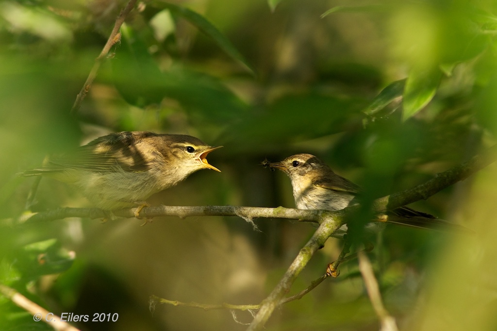 Beskrivelse: i den samme mindre busk som disse løvsangere sad i, var også tornsangere som fodrede deres unger. det var lidt pudsigt