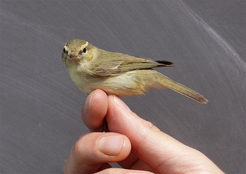 Beskrivelse: I dag d. 17-07-10 kl. 10.30 blev denne Phylloscopus sp 2k+ fanget ved Blåvand Fuglestation af Michael Johansen og Henrik Knudsen. Data: Venstre vinge: 61,5 mm, 1p > pc = 5 mm, 2nd P = 7 Indskæring på 3,4,5,6 P Næblængde (S): 1,2 cm (med skydelære) Næbbredde: 3,1 mm (med skydelære) Næb højde: 3 mm (med skydelære) Fuglen lignede mest en løvsanger/lundsanger type, ala nitidus. Fuglens overside var meget grønlig – hvilket henledte en til at tænke på skovsanger-farve. Især var den meget grønlig omkring overgumpen – ryggen ligeså, dog med lidt mere gråligt indslag. Øjenbrynstriben nåede ikke ud til nostrillerne. Denne var gullig – ligesom kinden, endog meget markant. Undersiden var gullighvid. Havde tydelig vingebånd på GC på begge vinger. Bestemmelsen til 2k+ hviler på de slidte tertiærer, samt noget slid på svingfjerenes spidserne. I øvrigt var 1st TF fældet og en ny under vækst Fuglen sås af Bent Jacobsen, Henrik Brandt, Michael Johansen og Henrik Knudsen. Kommentarer til fuglen ønskes!