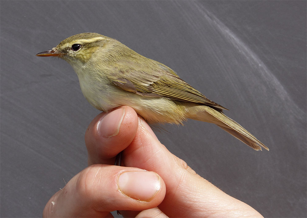 Beskrivelse: I dag d. 17-07-10 kl. 10.30 blev denne Phylloscopus sp 2k+ fanget ved Blåvand Fuglestation af Michael Johansen og Henrik Knudsen.
