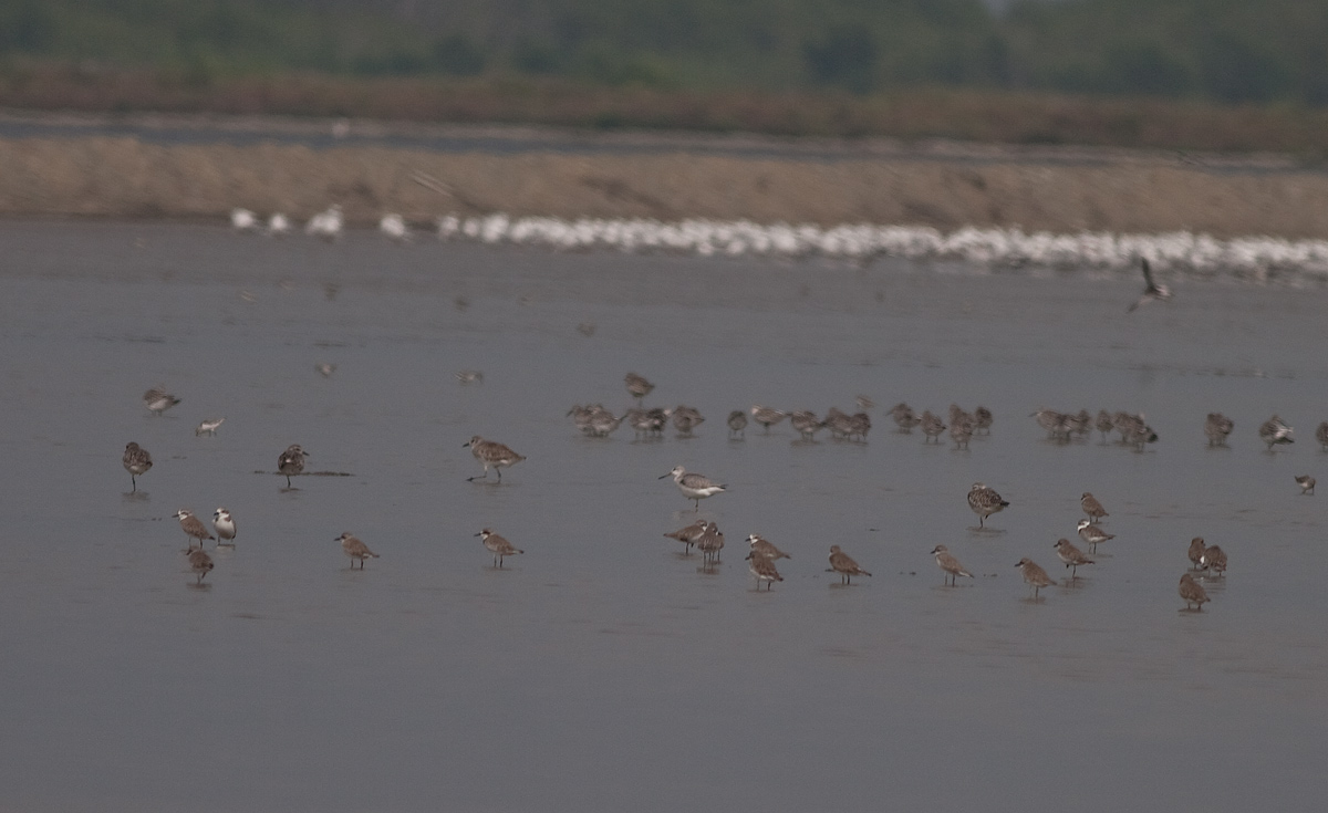 Beskrivelse: Pak Thale er bare en super vadefuglelokalitet, hvor to af mest sjældne i verden overvintrer, ganske vist fåtalligt: skenæbbet ryle og plettet hvidklire (eller Nordmanns hvidklire Tringa guttifer). Og på dette foto ses også et udvalg af andre vadefuglearter. I er velkomne til at gætte med!