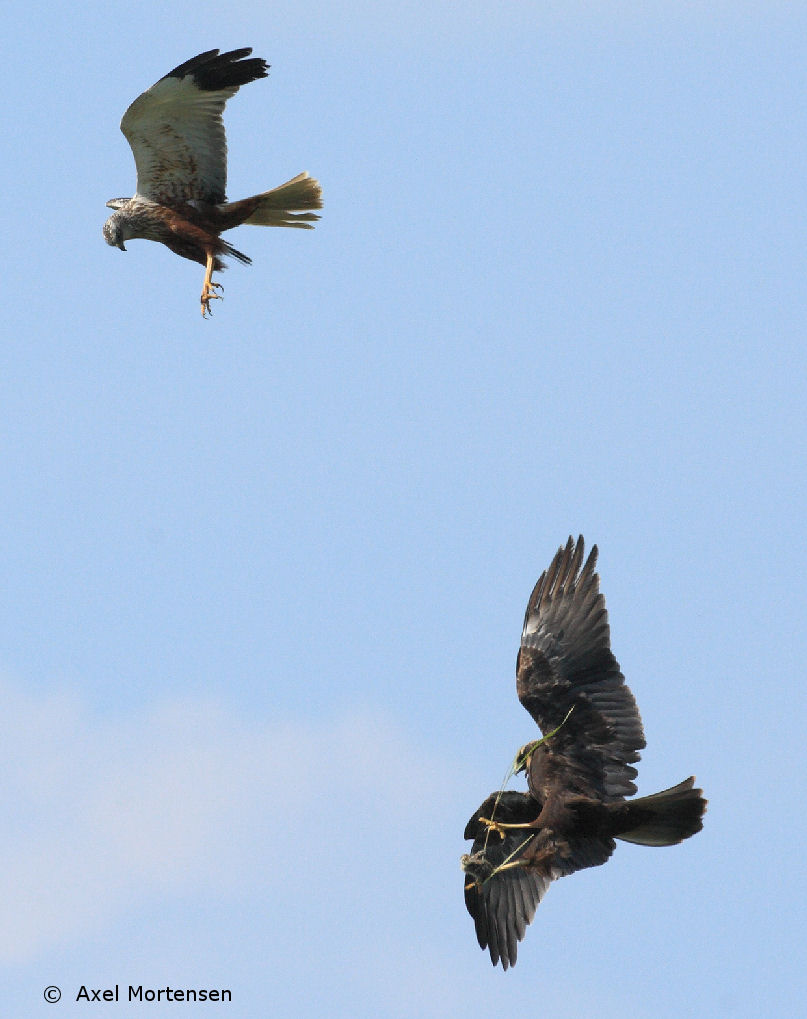 Beskrivelse: Rørhøghannen har i dag oplært ungerne i fødeoverdragelse i luften.
