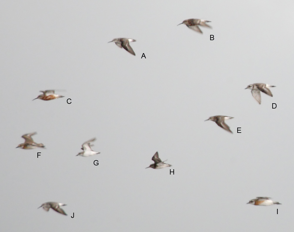 Jeg er helt enig med Daniel - 4 arter: Udover Skeryle, er der Kærløber (A, H); Krumnæbbet Ryle (B, C, J) og Mongolsk Præstekrave (D,F,I).