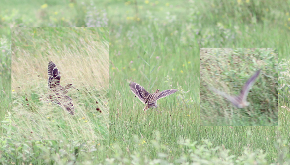 Beskrivelse: Fuglen blev trådt op på engene ved Farmen, Fanø. Den var meget eksemplarisk, og opførte sig som foreskrevet: lettede på 5 til max.10 m afstand (længe efter en del dobb.bek) og med lavt bulrende vingeslag som en agerhøne (altså ikke så kraftigt!), fløj lige og lavt, og landede kort efter, hvor den kunne genfindes og proceduren gentages nogle gange. Gav flere gange kort, dybt, lavmælt brokkende kald. Det var fan... svært at få foto af de fine hvide halesider, idet spredt hale kun sås i de første sekunder ved opflyvning hvor det var umuligt (både manuel og autofukus) at nå at stille skarpt pga. den korte afstand, og igen kortvarigt ved landing- men her så sent, at den var skjult af vegetation.