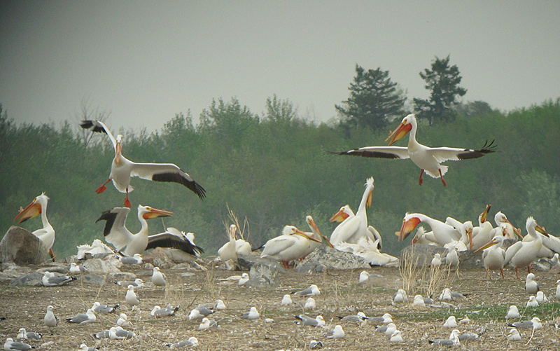 Beskrivelse: Koloni med krans af Canadamåger omkring.
