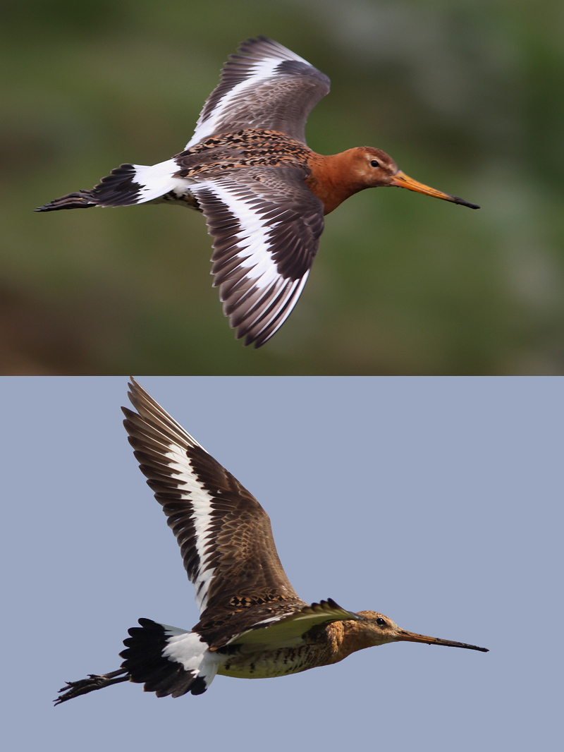 Beskrivelse: Sammenligning af flugtproportioner hos islandica (øverst) og limosa (nederst).