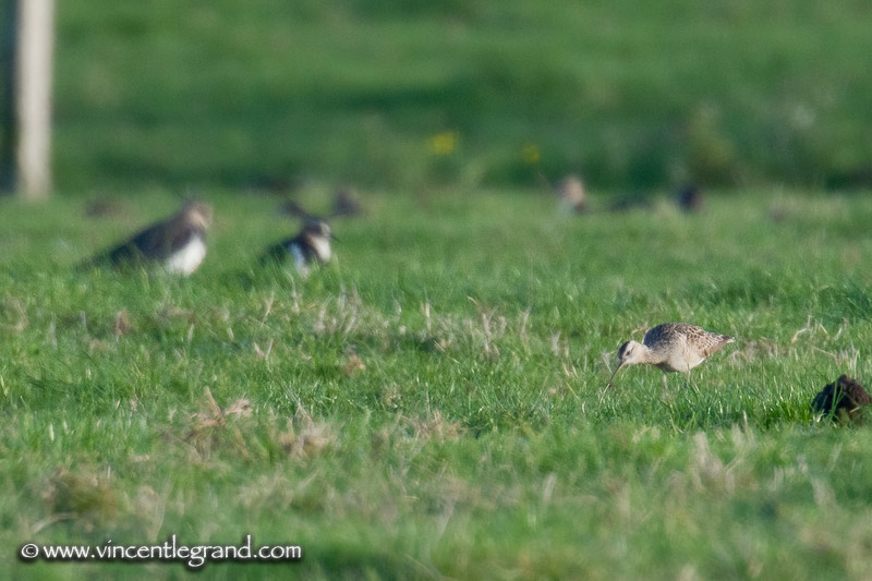 This curlew was the most active bird in the place he run from left to right with chicken-movements between lapwings and starling. We have not less than 10 minute to see it that he flew in the mixed flocks to finally disappear...