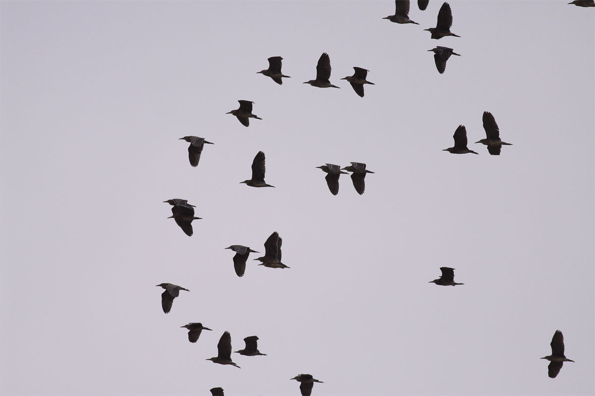 Beskrivelse: 36 Nathejrer på morgentræk over hotellet ved Sarafovo.