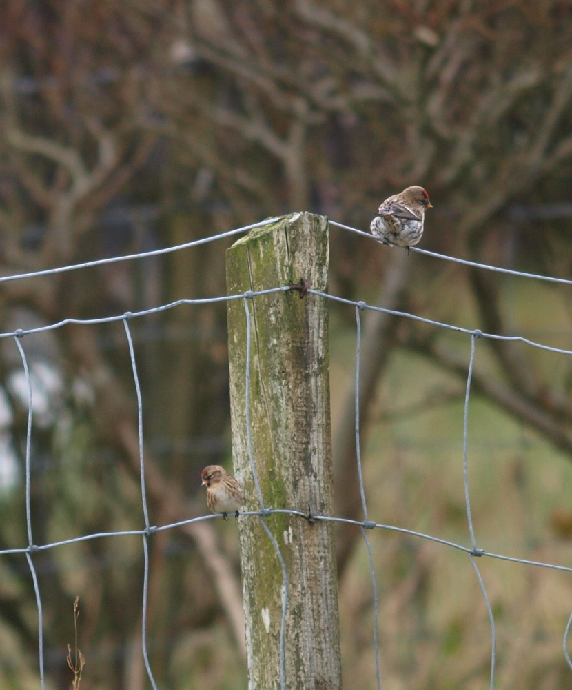 Beskrivelse: On this picture we see a typical big flammea on top of the fence and a very small dark bird, which I believe to be a carbaret - lesser redpoll. The only problem is that there are no previous records of lesser redpolls on the Faroes and biometrics are probably required for safe id. On the other hand a rostrata from Greenland or a icelandica should be bigger than a flammea, so can the id be established after all?