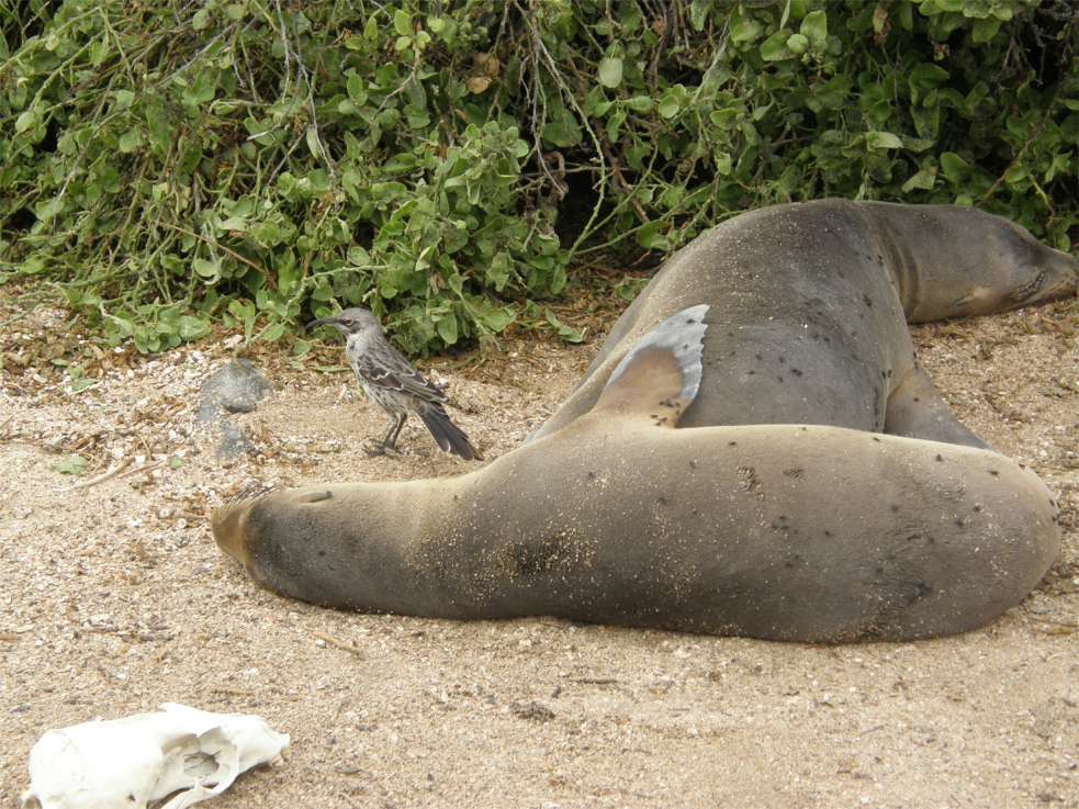 Beskrivelse: Españolaspottedrossel (Nesominus macdonaldi) Hood Mockingbird. Arten er endemisk til øen Española på Galapagos.