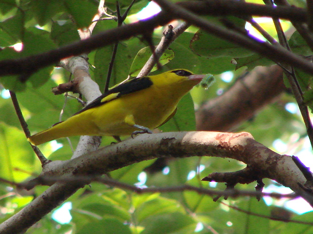 Untill recently consiered to be conspecific with Oriolus oriolus. Seperated in "Birds of South Asia" by Rasmussen and Anderton (2005. Oriolus kundoo has among other distinguishing characteristics a longer lighter red bill, and more black behiend the eye. Vocalizations also differ.