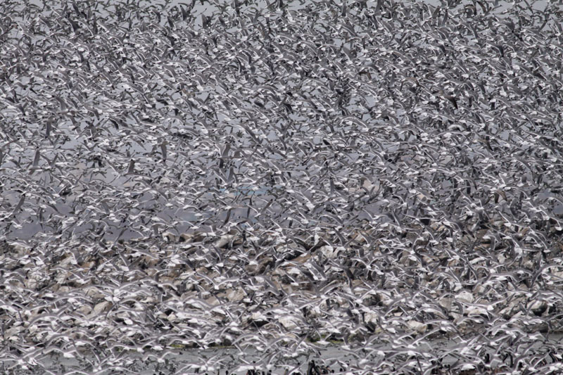 Beskrivelse: I november samles Præriemåger i tætte, tusindtallige flokke langs Perus kyster. Omkring Lima tælles nemt over 50.000 på en enkelt dag! Her er et udsnit af en flok på 25.000, der i panik letter da en jagende Vandrefalk dukker op.