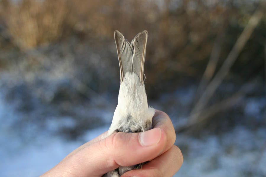 Beskrivelse: Denne 1k hvidsisken fik ring om benet på Gedser Odde den 13/12. Umiddelbart passede alle de gængse karakterer på hvidsisken: Hvide underhaledækfjer uden sort. Kraftige hvide vingebånd. Lille næb og lyst ansigt. Smalle destinkte flankestriber. Flødefarvet anstrøg på forbryst og ansigt. Til start tog jeg et lille forbehold for bestemmelsen, da fuglen ikke havde bred hvid overgump (selvom det ser sådan ud på det her billede). Der var sort-centrede fjer i overgumpen og der var ikke det forventelige brede hvide område på overgumpen. Jeg har efterfølgende studeret skindsamlingerne på Zoo.Museum og har fundet flere unge hvidsiskener med lignende overgump, hvorfor fuglen endelig kunne bestemmes. Billeder af overgumpen er sendt til Netfugl.