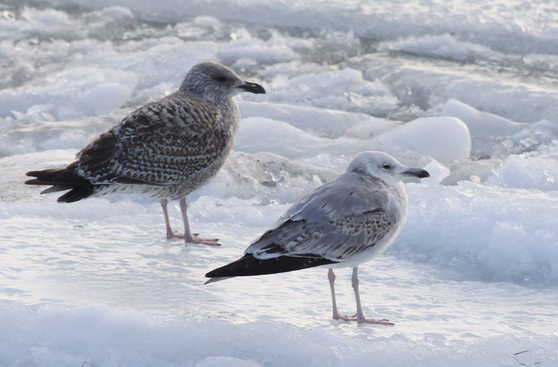 På den stående fugl bemærkes desuden det meget slankere næb end Sølvmågens, og det renhvide hoved, der er i god kontrast til det mørkplettede nakkebånd.
