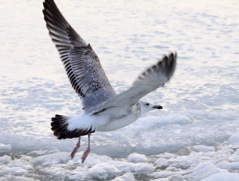 Beskrivelse: 2-års Kaspisk Måge. Ligner lidt 1. vinterdragt, men undervingen er endnu hvidere, ligesom ryggen og dele af dækfjerene er rent grå.