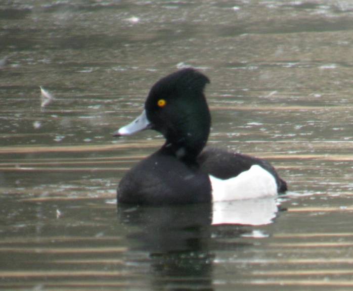 Note the green "gloss" on the head, which was/is very prominent on this bird. Green "gloss" is apparently very common in this hybrid form, which seems a bit odd, since none of the parents can be claimed to be radically "green headed". The white wedge in front of the grey flanks is usually less conspicuous in the hybrids than in pure Ring-necked Duck (see eg. here: http://www.netfugl.dk/pictures.php?id=showpicture&picture_id=38695).