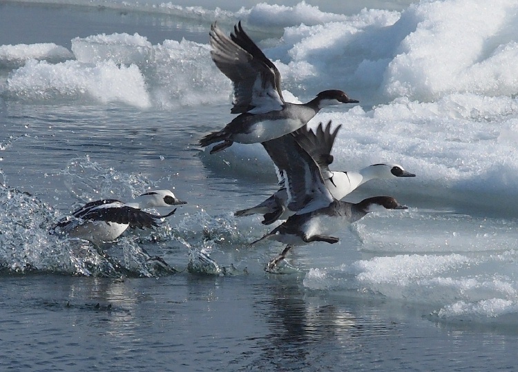 Beskrivelse: Sydøstenvinden har sat isflagerne på sundet i drift, og da vågen bliver mindre og mindre, går flokken på vingerne for at søge efter et andet sted at fouragere.