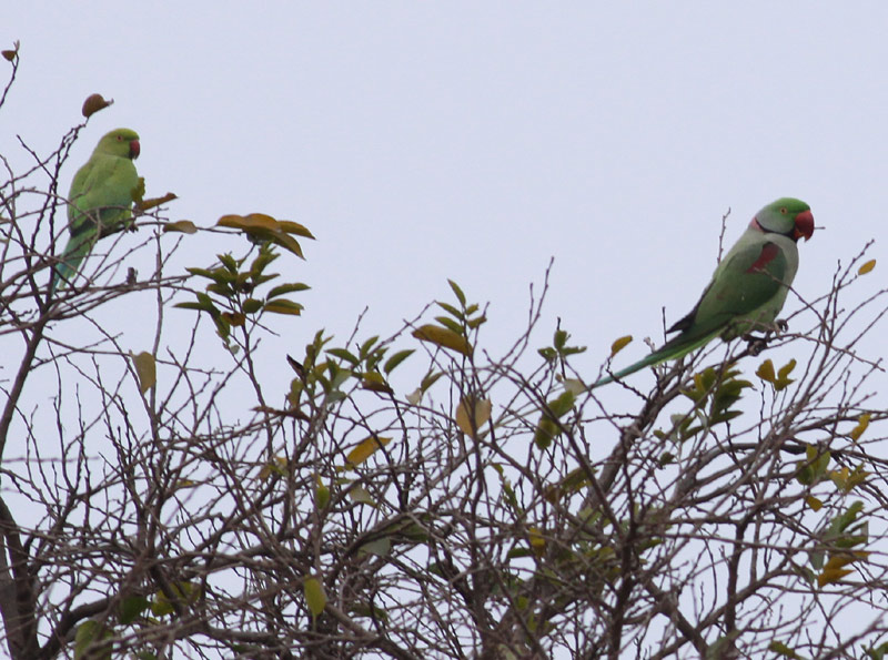Beskrivelse: Alexanderparakit (t.v.) er almindelig i det meste af Indien, mens storesøster Alexandrine er betydeligt mere fåtallig. Den store art ses her til højre, hvor man tydeligt ser, hvor meget større den er. Stemmen er desuden grovere og dybere. De to arter indbyrdes minder mig lidt om Rødstrubet Lom kontra islommerne.