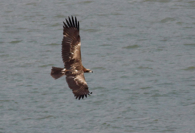 Beskrivelse: Ung Pallas Havørn. Oversiden minder om Steppeørnens, men mangler de hvide håndrodspletter, der kendetegner aquila-ørnene.