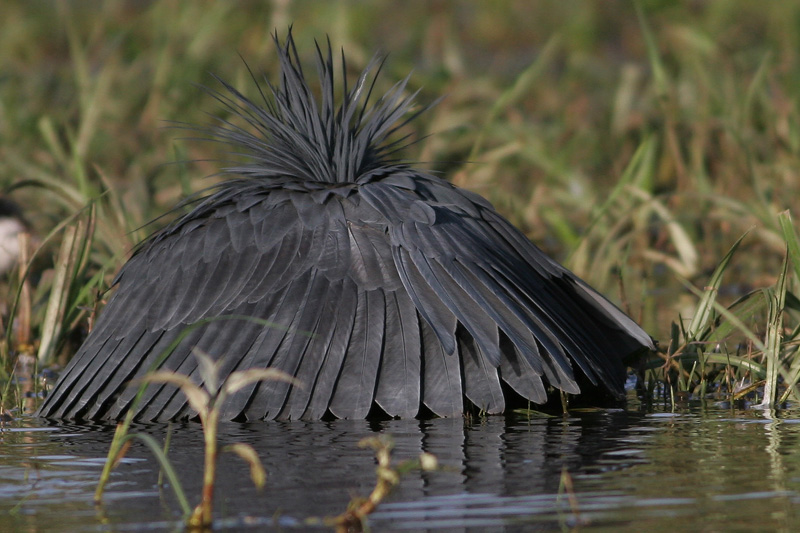Beskrivelse: Billedet her forklarer det danske navn Skyggehejre. Med vingerne danner fuglen en "paraply" over vandet, som så skulle tiltrække de småfisk fuglen hovedsageligt lever af.