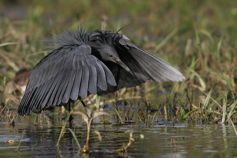Beskrivelse: Billedet her forklarer det danske navn Skyggehejre. Med vingerne danner fuglen en "paraply" over vandet, som så skulle tiltrække de småfisk fuglen hovedsageligt lever af. Note the "umbrella" feeding action.