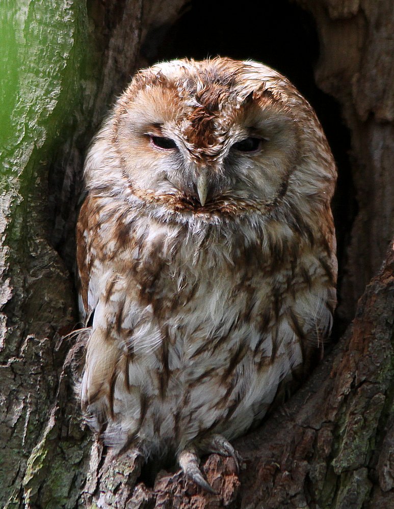 Beskrivelse: Natuglen soler sig i sit hule træ i mosen.