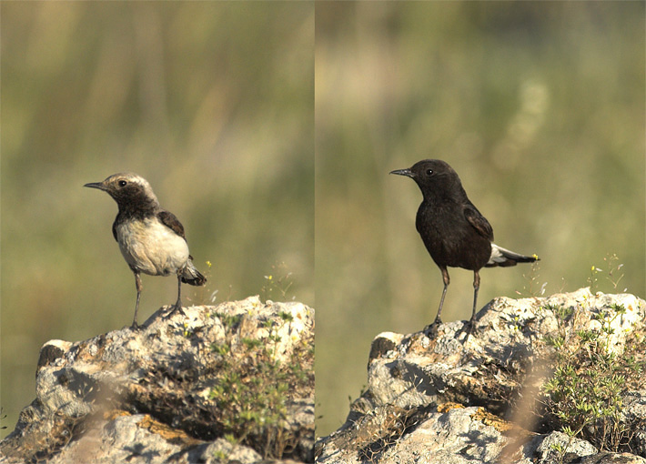Beskrivelse: Hvidrygget Stenpikker hun og den mørke Kizilkuyu-han,fotograferet på samme sten fra samme afstand.