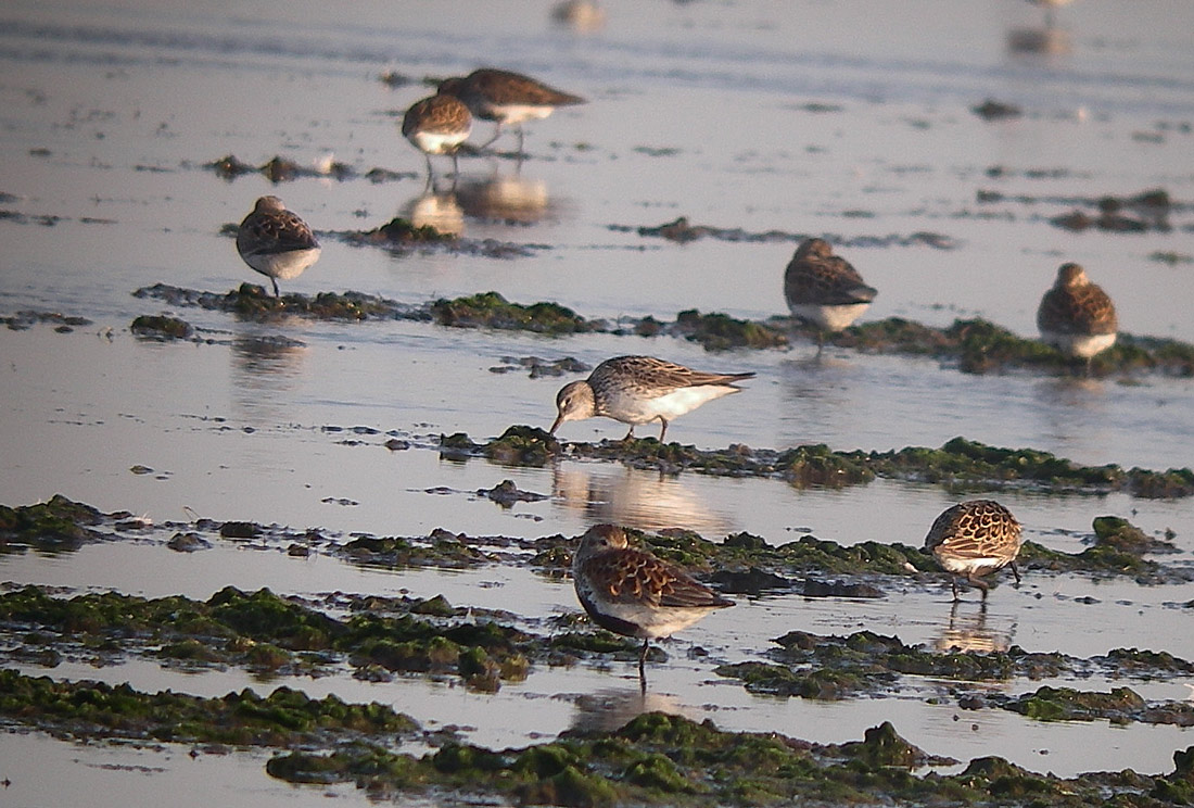 Mange tak. Denne flok ryler befandt sig i Tippesande, som er en lavvandet vig og dermed en del af Ringkøbing Fjord, som er en brakvandsfjord med en vintersaltholdighed på ca. 5 promiller og en sommersaltholdighed på ca. 12 promiller. Ved sydlige vinde bliver dele af Tippesande enten tørblæst eller bestående af fugtig vade. De "banker" du kan se på fotoet er aflejret søsalat.