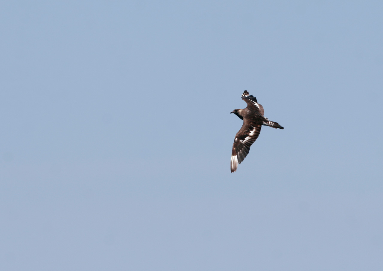Beskrivelse: From the perspective of a seawatcher from the Northern Hemisphere the skuas all looked strangely pied at a distance, all being dark brown on the upper wings broardly patched with white. A closer look revealed the white patches being the result of moult, unmasking white feather bases.