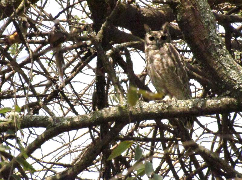Beskrivelse: Var ikke svær at støve op i hotelhaven, da en større, blandet flok småfugle forfulgte den rundt i området, bla. Speckled Mousebirds (til venstre i billedet).