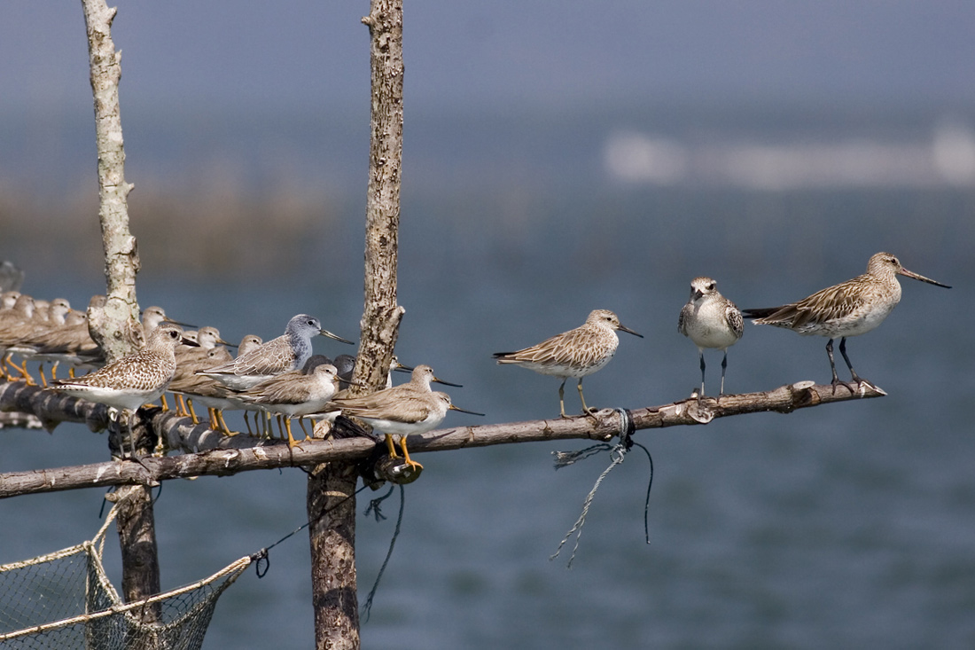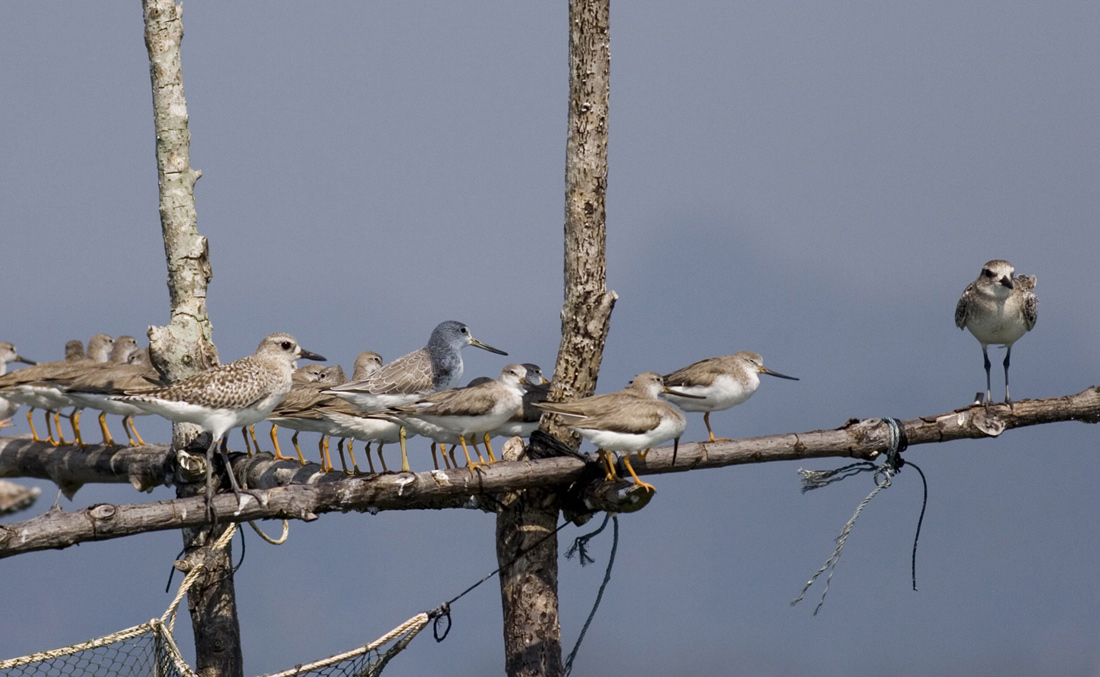 Hej Morten , den du kalder kobbersneppe sp. til venstre er Tringa guttifer. Der er ca 20 terekklire - 1 sakhalinklire - 2 stranshjejler - 1 kæmperyle og 1 lille kobbersneppe.