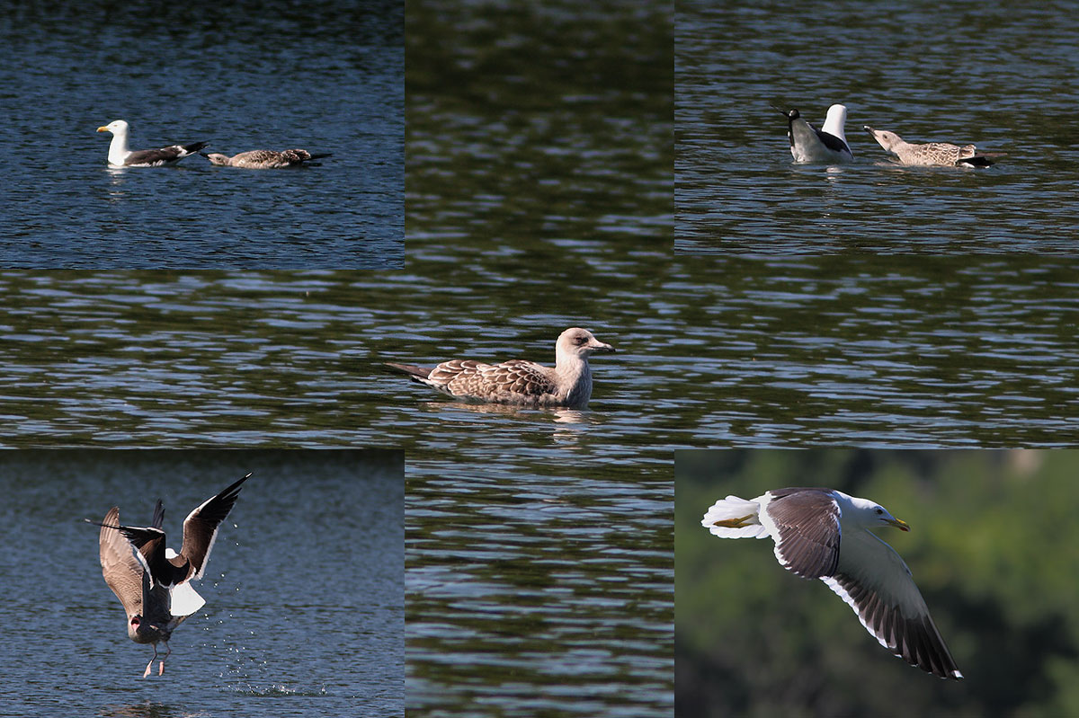 Fuglene befinder sig i Hammersøen tæt på Hammerbruddet. På de to øverste billeder ses tydeligt tiggeadfærd - en enkelt gang lykkedes det at lokke et eller andet fra forældrefuglen (hunnen?). Imens havde den anden fugl (hannen?) travlt med at jage rundt med de sagesløse sølvmågeunger. Gang på gang angreb han sølvmågeungerne (nederste billede til venstre), og til sidst var de fleste fugle fortrukket til den anden ende af søen.