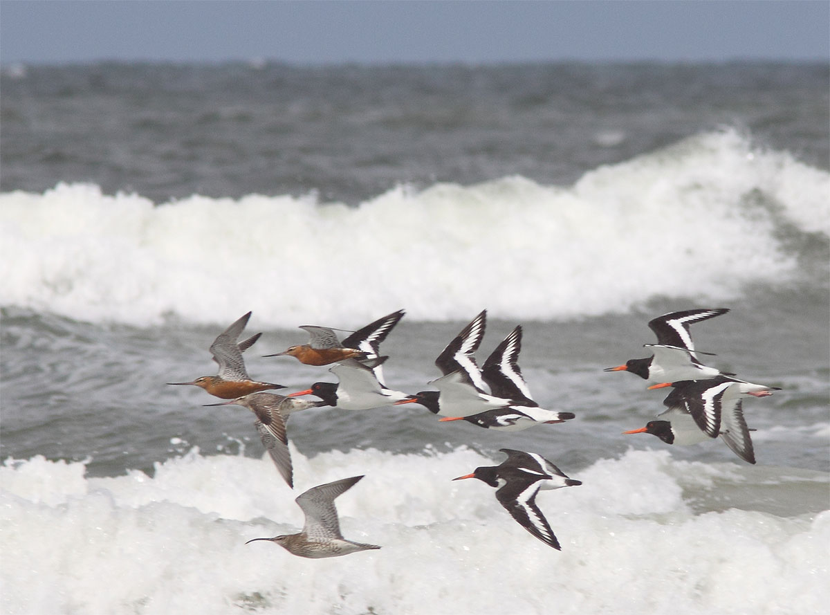 Beskrivelse: Strandskader med Småspove og Ll.Kobbersneppe i førerfeltet mod sydligere breddegrader.