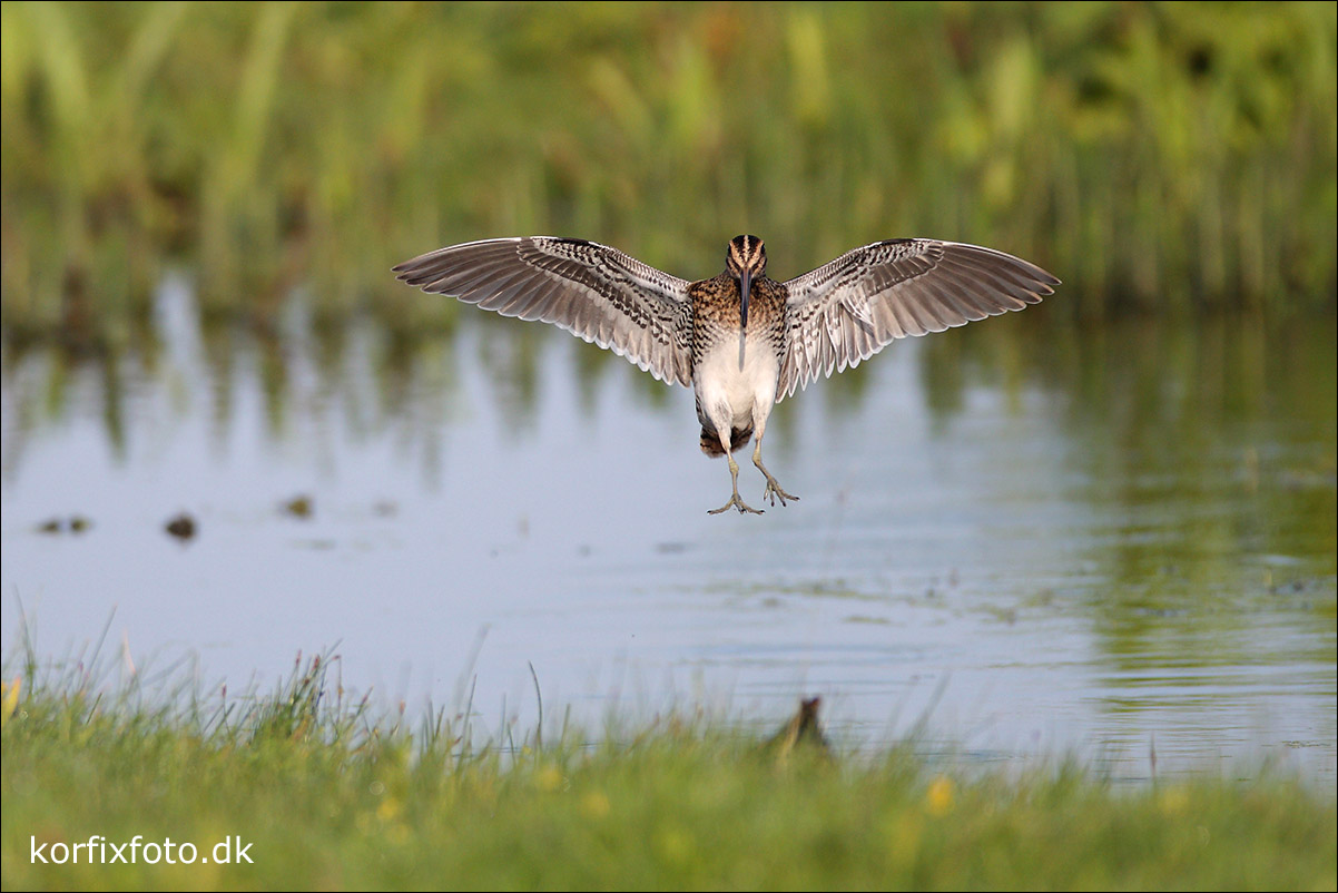 Nej jeg har ikke brugt skjul, ikke andet i form af de buske som står i vejkanten, der sad flere bekkasiner rundt omkring og man kan ane en lige under den der er ved at lande.