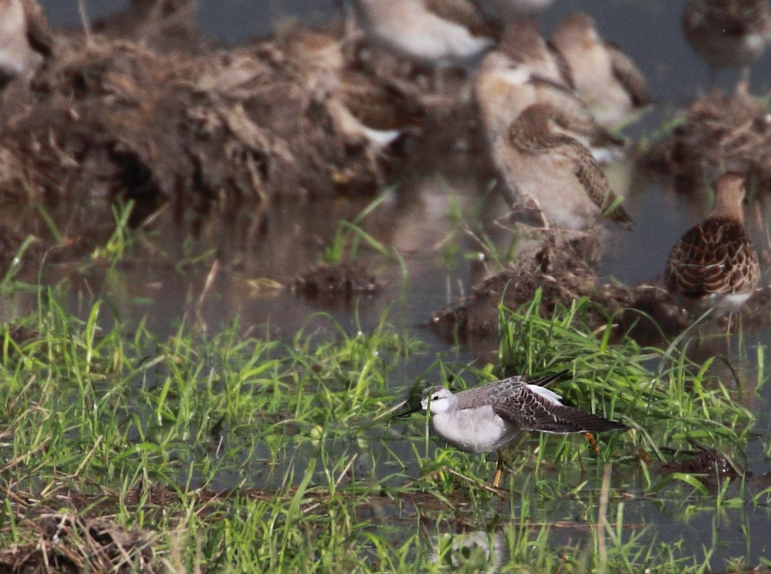 Beskrivelse: Bemærk gule ben og hvid overgump. Fuglen holdt sig tæt til en flok Brushøns.