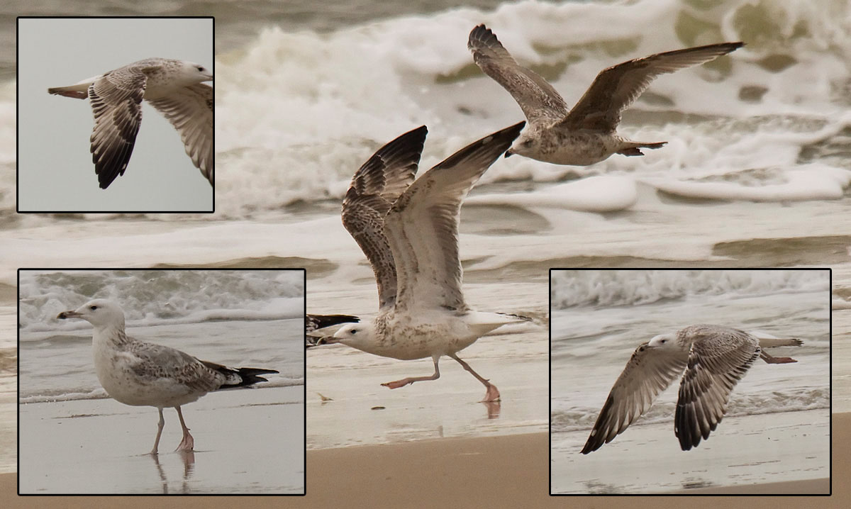 Skudt til Pallas træf i Blåvand. Vi mente dette måtte være en Kaspisk Måge pga. flere karakterer: Generelt lyst indtryk med lyst hoved, lyse undervinger, mørke øjne, boa i nakken, karakteristisk lyst spejl på p10, som Sølvmåge vist ikke har som 2K ? Sort på spidser af p10-p5(p4). Næb ser vel ok ud men ikke vildt overbevisende (skal jo være langt uden synlig gonys vinkel), ben ser lidt lange ud måske, men jeg kan ikke få mig selv overbevist om, at det er noget der springer i øjnene. Undergump skal være hængende, men det er et kendetegn jeg plejer at springe over, for det synes jeg altså også at sølvmåger tit kan have. Det kommer an på hvor opstrakt de står (Kaspisk skulle stå mere opstrakt end andre, hvilket jeg dog ikke kan se på dette billede). Summa summarum synes jeg, der er nok kendetegn på plads til at det er en Kaspisk.